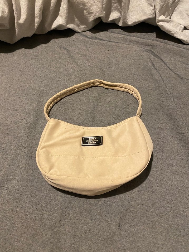 Bej renkli, desen içermeyen, yumuşak sentetik kumaştan üretilmiş kadın omuz çantası. Pastel tonuyla gündelik sokak stiline uyum sağlar.