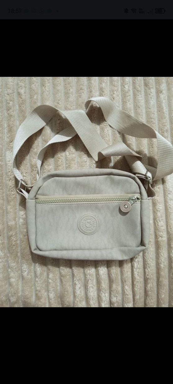 Yumuşak sentetik kumaştan yapılmış, omuzda kullanılabilen bej kadın çantası. Önünde fermuarlı cep ve ayarlanabilir askı bulunur.