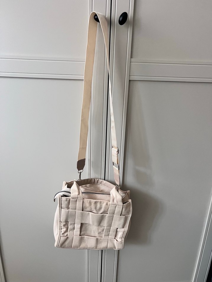 Keten kumaştan yapılmış, tokalı ve ayarlanabilir askılı bej kadın omuz çantası. Minimalist ve desensiz tasarımıyla günlük kullanıma uygun.