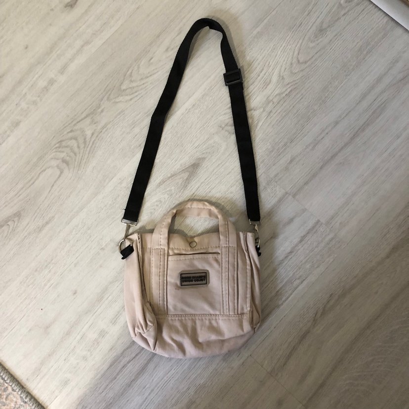 Pastel bej renkte, sentetik kumaştan yapılmış kadın çantası. Ayarlanabilir siyah askısı ve desen içermeyen tasarımıyla günlük sokak stiline uygundur.