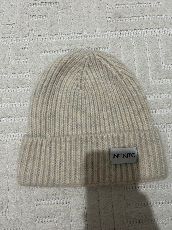 Bej renkli, örgü kumaştan yapılmış kadın bere, katlanabilir manşeti üzerinde "INFINITO" etiketi bulunur. Gri tonlarıyla trend günlük stile uygundur. En:23 cm Boy:21 cm