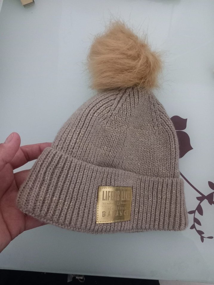 Yumuşak örgü kumaştan yapılmış, bej renkli ponponlu kadın bere. Kıvrımlı manşeti ve dekoratif etiketi ile rahat ve şık bir sokak stili ürünü.
