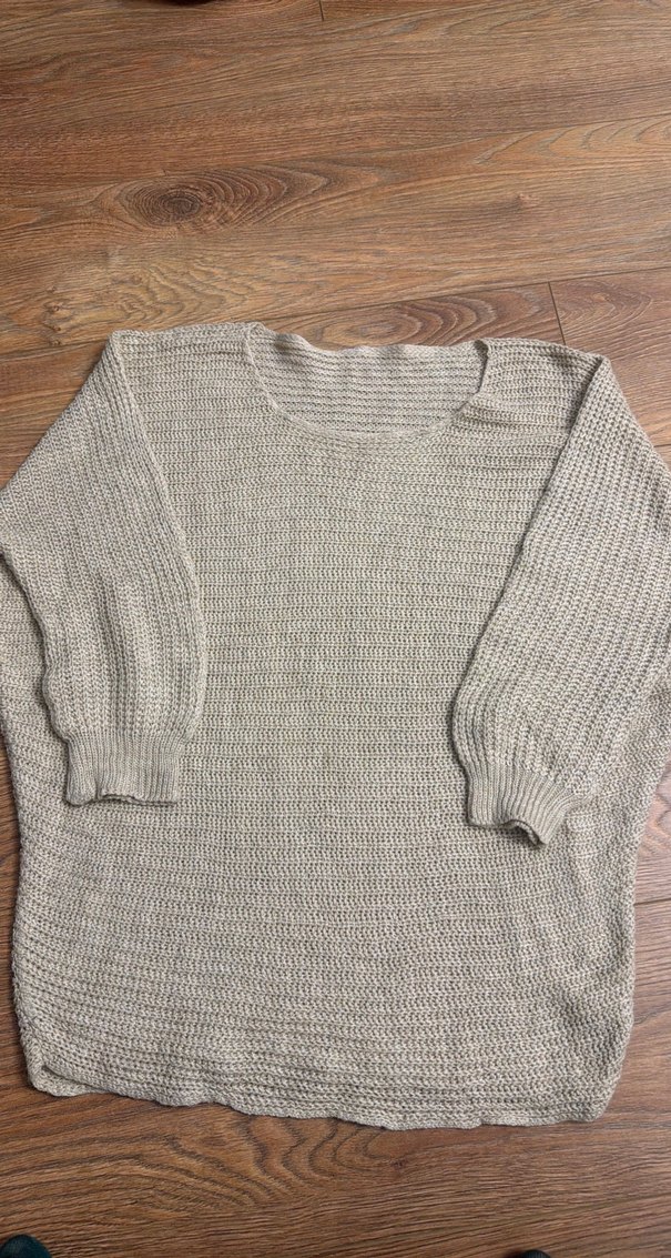 Bej renkli kadın kazak, uzun kollu ve yuvarlak yakalıdır. Yumuşak örgü kumaştan yapılmış, rahat ve sade bir tarza sahiptir. Defosuz