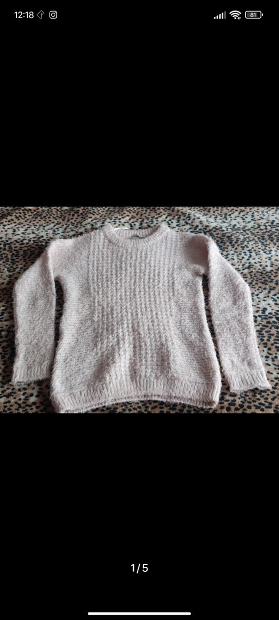 Bej renkli, örgü kumaştan yapılmış, yuvarlak yaka ve uzun kollu, rahat kesime sahip sade ve konforlu kadın kazak.