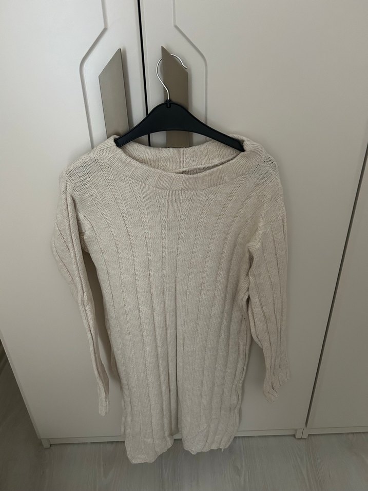 Bej renkte, örgü desenli yün elbise. Yuvarlak yaka, uzun kollu ve bol kesim, midi boyda rahat bir model.