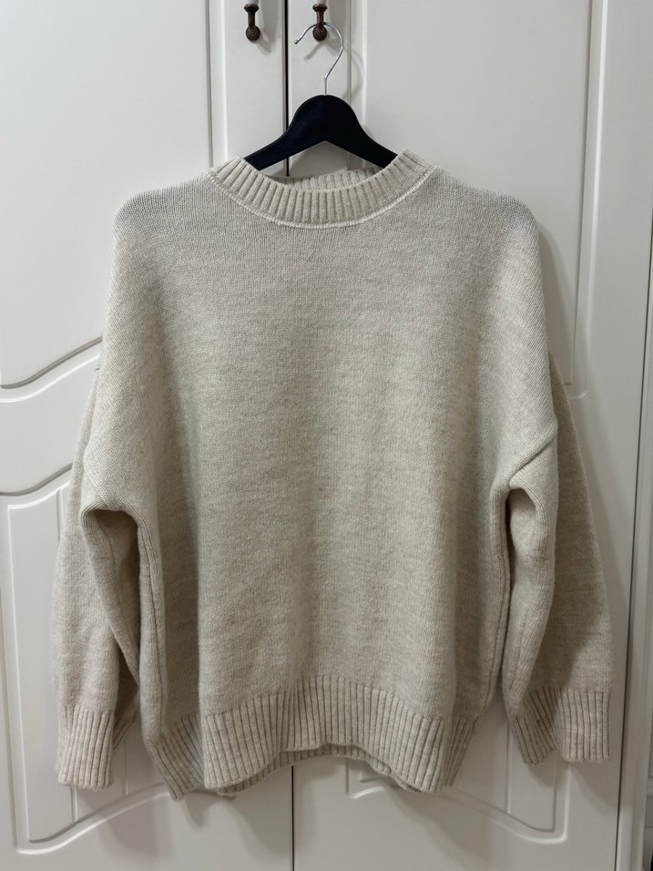 Bej renkli, yuvarlak yaka ve uzun kollu, bol kesim örgü yün kazak. Günlük kullanıma uygun rahat ve sade tarz.