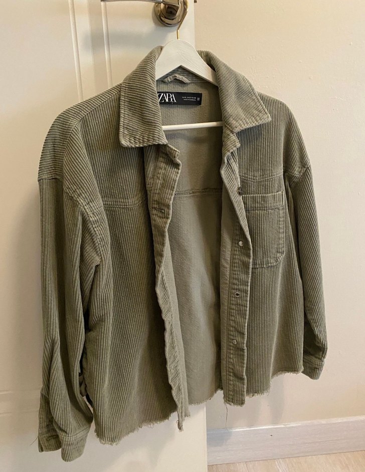 Yumuşak keten kumaştan, uzun kollu ve düğmeli, haki renk oversize ceket. Rahat kesimi ve notched yakasıyla günlük kullanıma uygun.