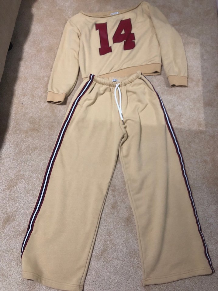 Bej renkte, oversize kesim uzun kollu ve bisiklet yaka üst ile yanları şerit detaylı geniş paça pantolonlu kadın eşofman takımı. 14 numara detayı sportif bir hava katıyor. Rahat ve günlük kullanım için uygun. ♀️beden-s temiz sorunsuz