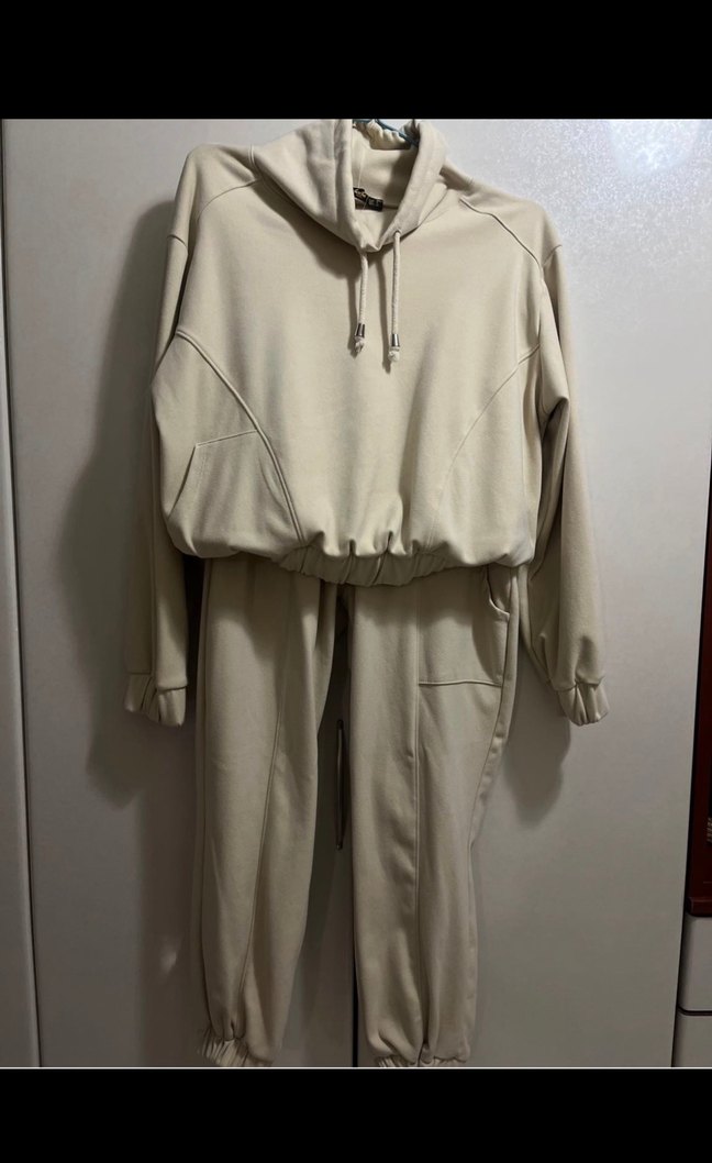 Bej renkte, yumuşak ve sıcak kumaştan, yüksek yakalı ve uzun kollu kadın oversize eşofman takımı. Günlük rahat kullanım için uygundur. S ve m ye uygun.