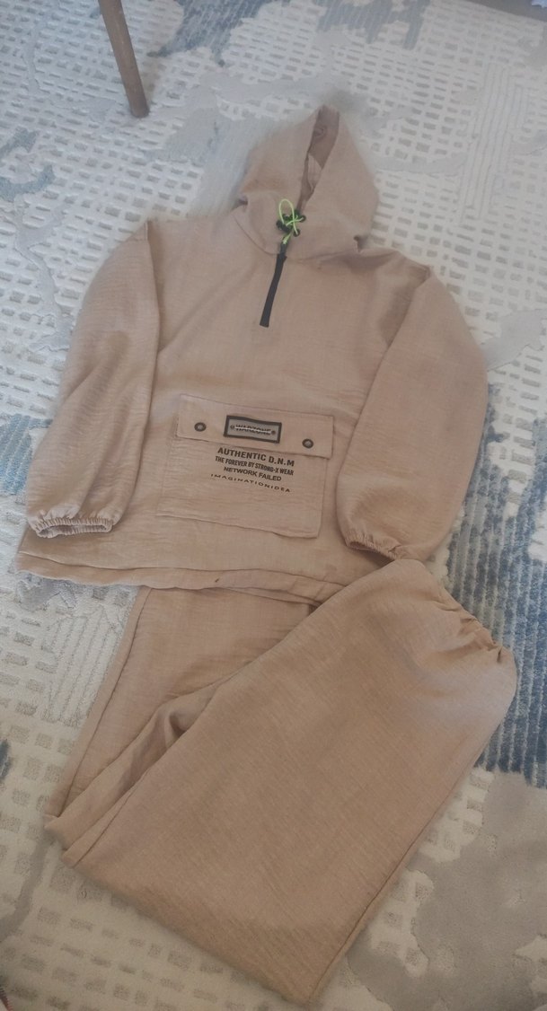 Bej keten kumaştan, oversize kesim kadın eşofman takımı. Uzun kollu, fermuarlı yakalı ve ön cepli, rahat sokak stili için uygun.