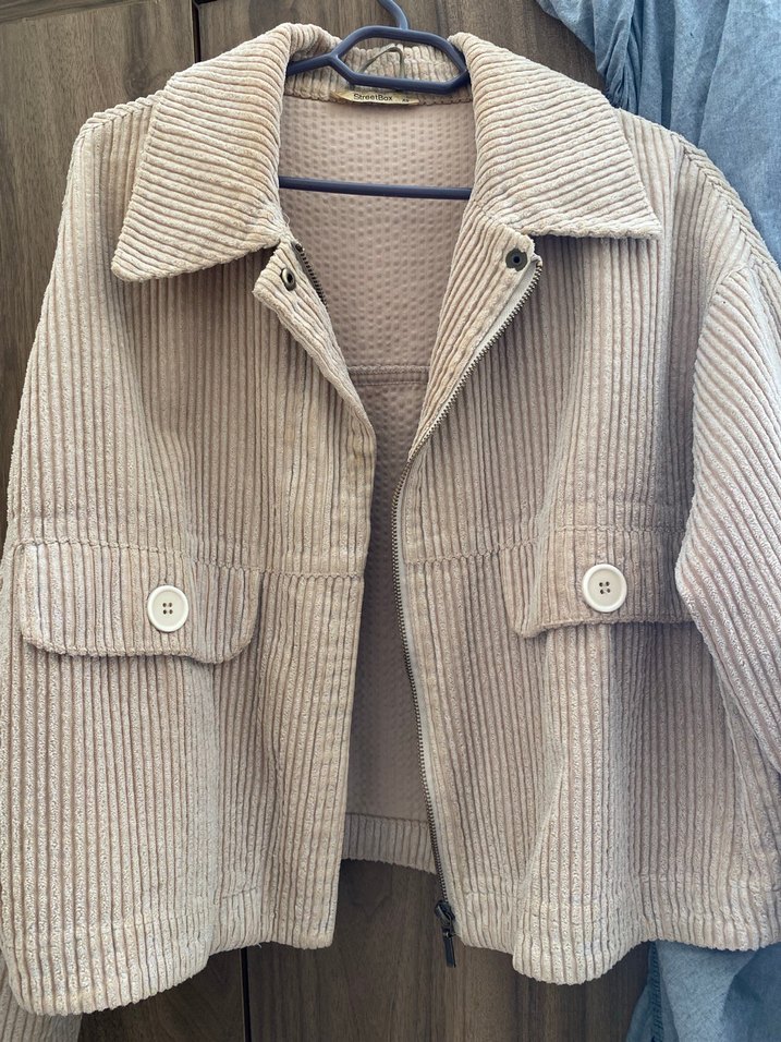 Bej renkte, düğmeli ve notched lapel yakalı kadın ceket. Yumuşak keten kumaştan, uzun kollu ve oversize kesim. Günlük rahat sokak stili için ideal. Xs yazıyor ama S de olur