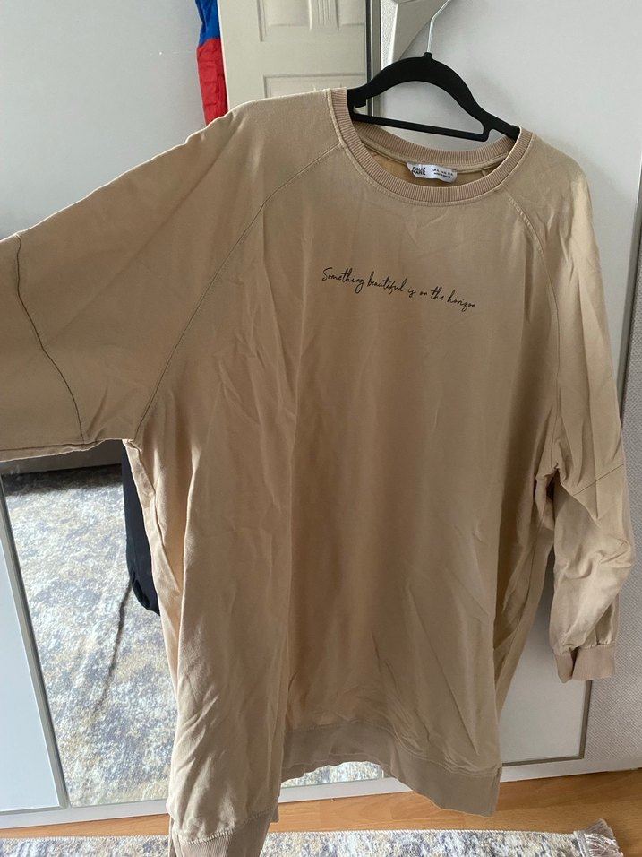 Yumuşak keten kumaştan, bol kesim, uzun kollu, bisiklet yaka bej sweatshirt. Üzerinde baskılı slogan bulunur, günlük kullanım için uygundur.