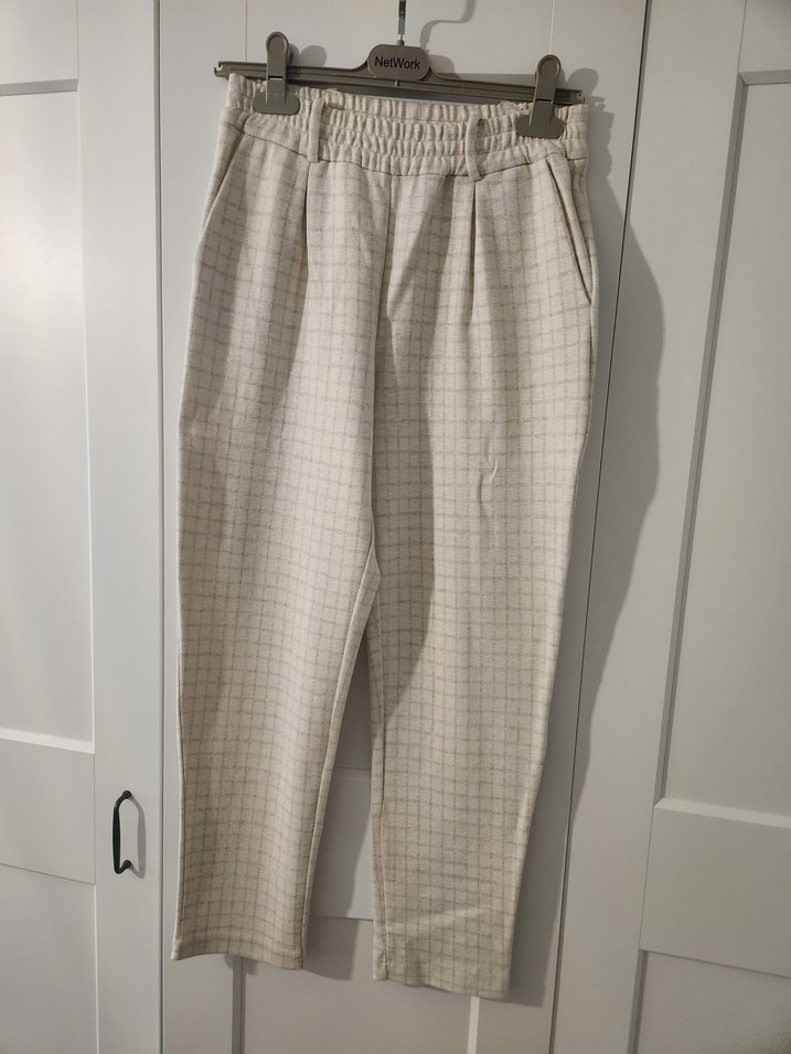 Bej pamuk kumaştan, pilili ve normal boy midi kesim, rahat kesimli kadın pantolon. Gri ince kareli deseni ve lastikli beliyle ofis ve günlük kullanıma uygun. kış sezonundan almıştım