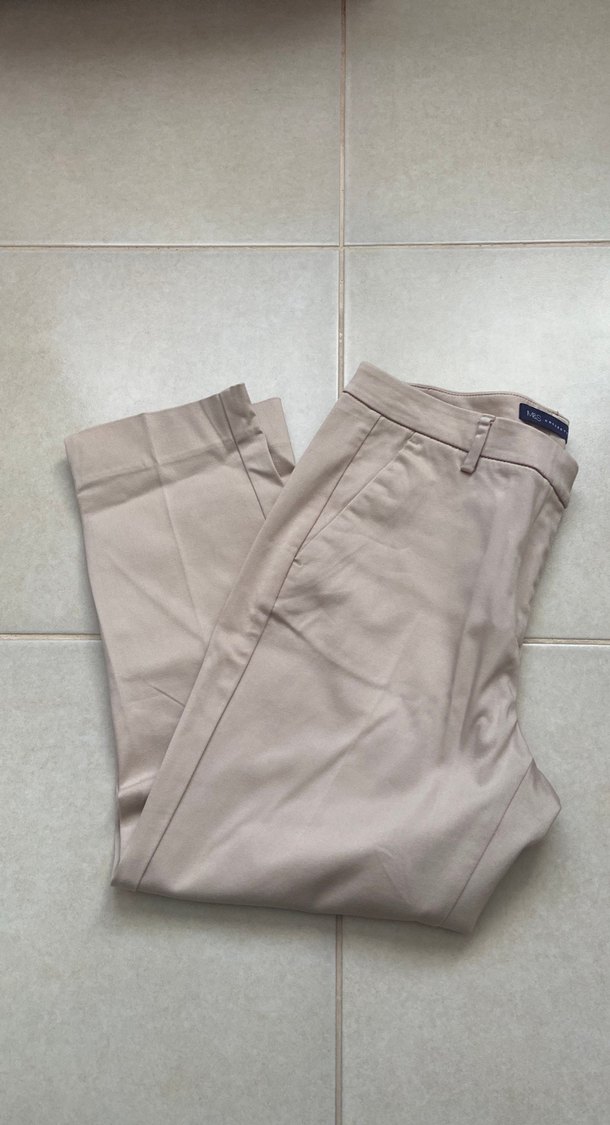 Bej renkte, pamuk kumaştan yapılmış, normal boy ve regular fit kadın pantolon. Ofis kullanımı için uygundur, desen içermeyen sade tasarım sunar. Midi pantolon
