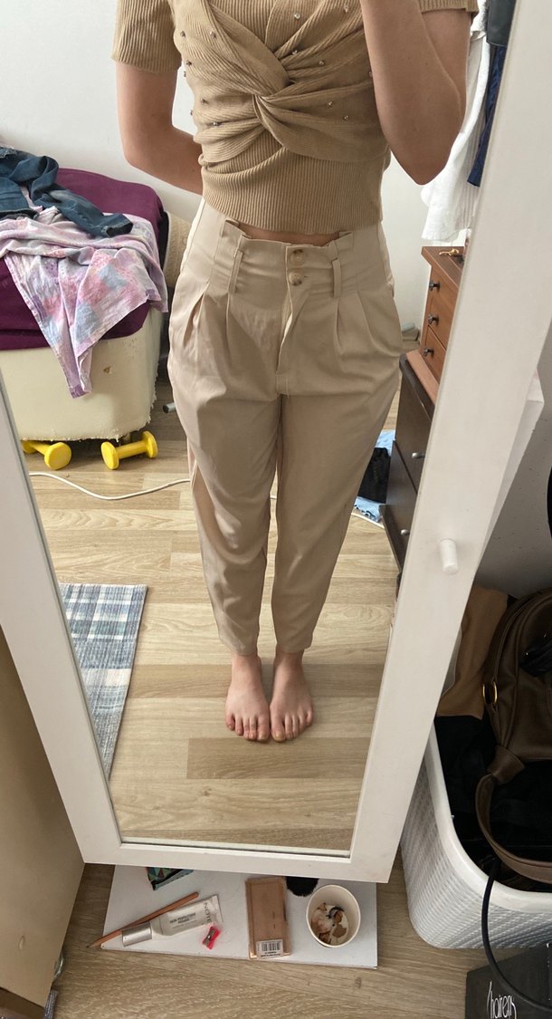 Bej renk, pamuk kumaştan yapılmış, salaş kesim ve midi boy kadın pantolon. Günlük sokak stili için rahat ve şık bir tercih.