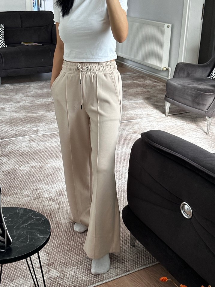 Bej renkte, pamuk kumaştan, rahat kesim ve midi boy kadın pantolon. Günlük kullanım için pastel tonlarda, zahmetsiz şıklık sunar.