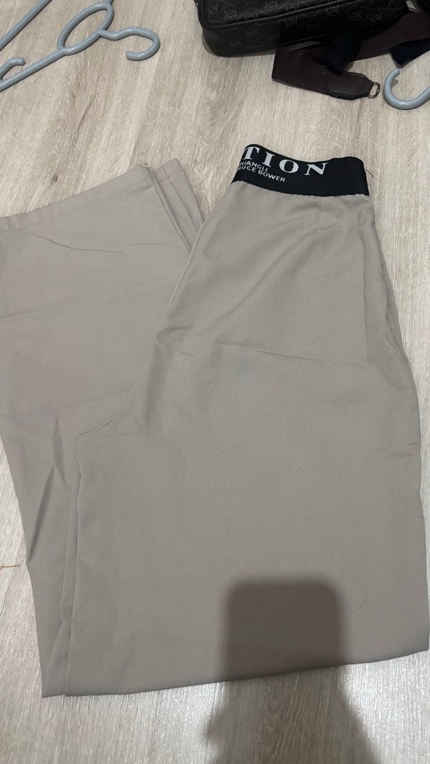 Bej pamuklu kumaştan üretilen, bol kesim ve boy pantolon, rahat sokak stili için uygun, desen içermeyen günlük kullanıma uygun model.