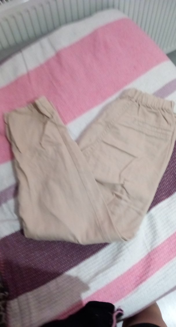 Bej renkli pamuklu kumaştan yapılmış, bol kesim ve midi boy pantolon. Rahat ve şık, günlük kullanıma uygun.