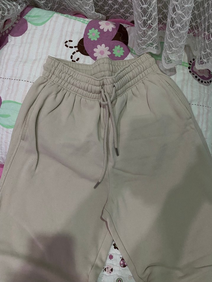 Bej uzunlukta, pamuklu, bol kesim ve bağcıklı bel detaylı rahat eşofman. Günlük kullanım için uygundur.