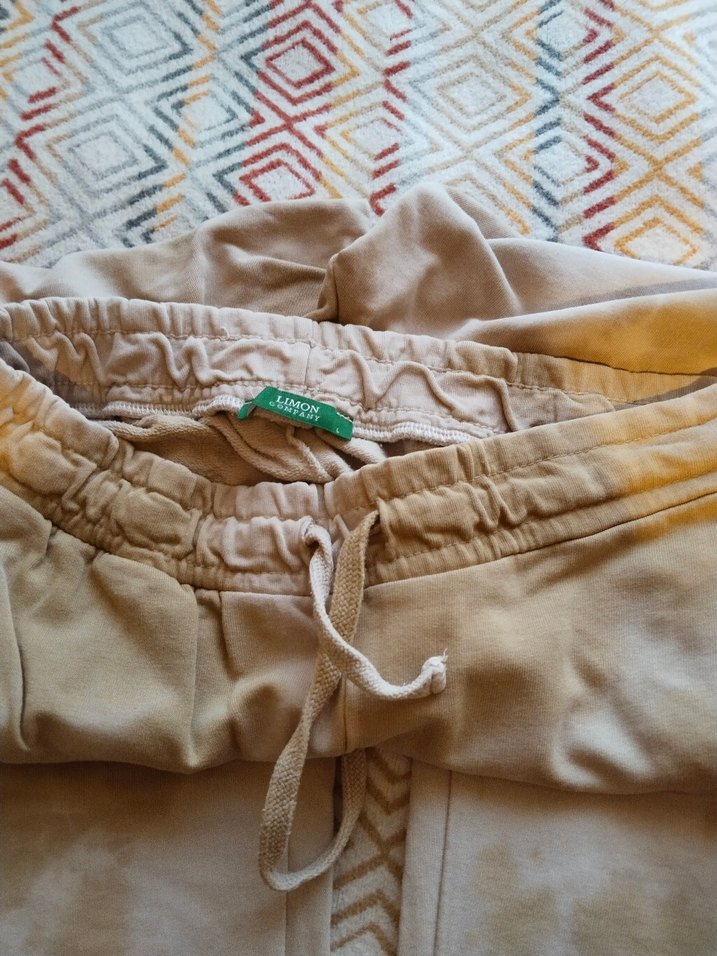 Bej renkte, pamuklu kumaştan yapılmış, bol kesim günlük rahat sokak stili pantolon ve üst . Midi boyda, gündelik kullanıma uygun.alt L beden üst M