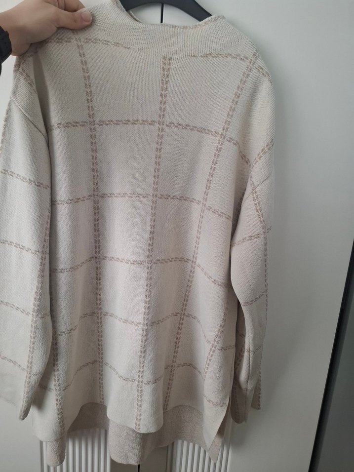 Bej renkli, pamuklu, triko kazak. Yuvarlak yaka ve uzun kollu, rahat kesim ve normal boyda, günlük kullanıma uygun. simli