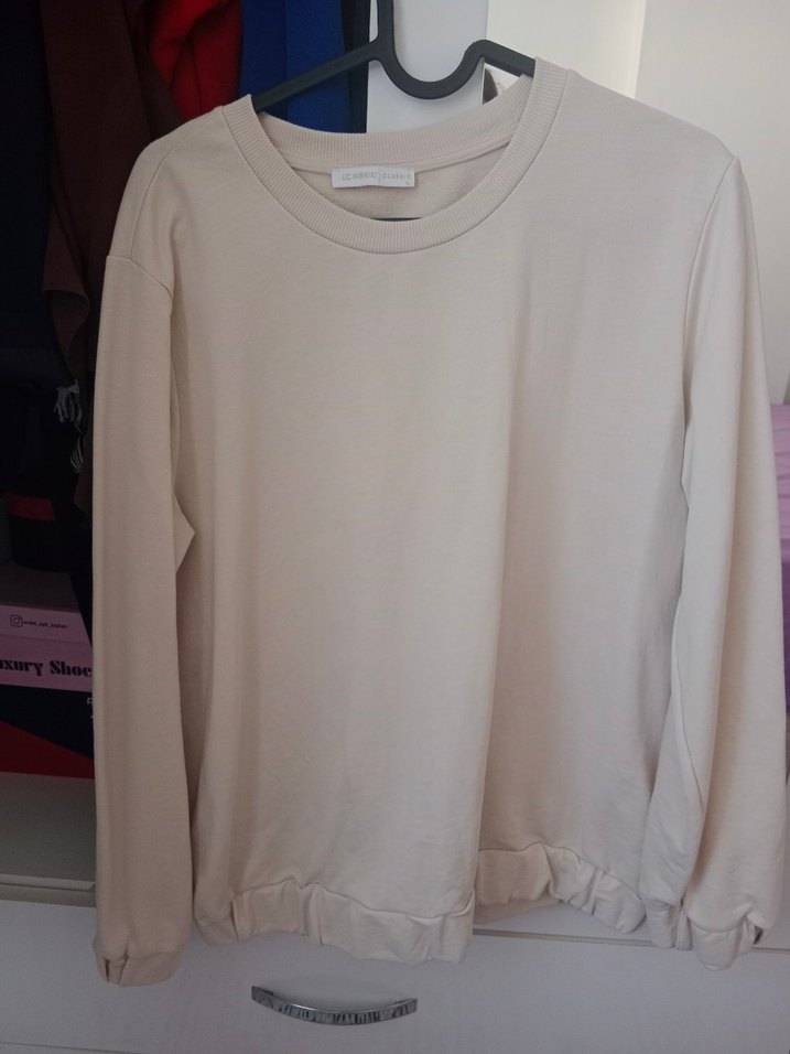 Bej pamuklu sweatshirt, yuvarlak yaka ve uzun kollu. Rahat kesimli, normal midi boyda, günlük rahat sokak stili için uygun. beden büyük ama kalıbı dar