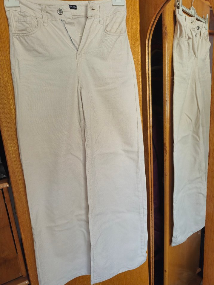 Bej renkte, pamuk kumaştan üretilmiş, bol paça pantolon. Düz ve sade tasarımıyla günlük kullanıma uygundur. 26 beden ancak dar kalıptır. Defosuzdur. Sadece 1 kez giyildi.