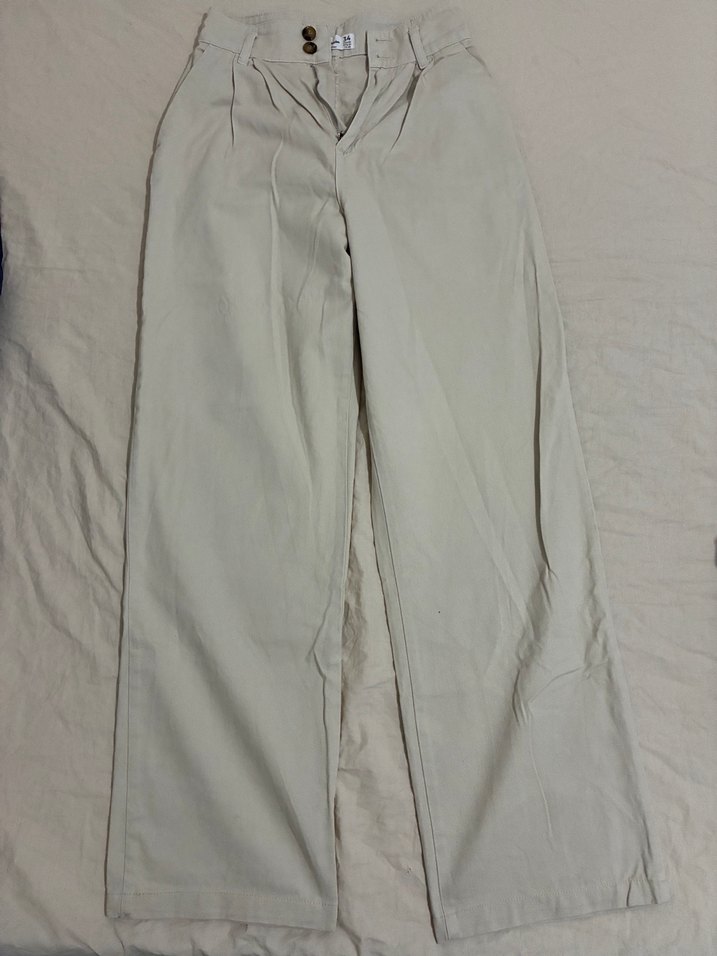 Yumuşak keten kumaştan, bej midi uzunlukta, bol kesim kadın pantolon. Günlük rahat kullanım için zahmetsiz şıklık sunar.