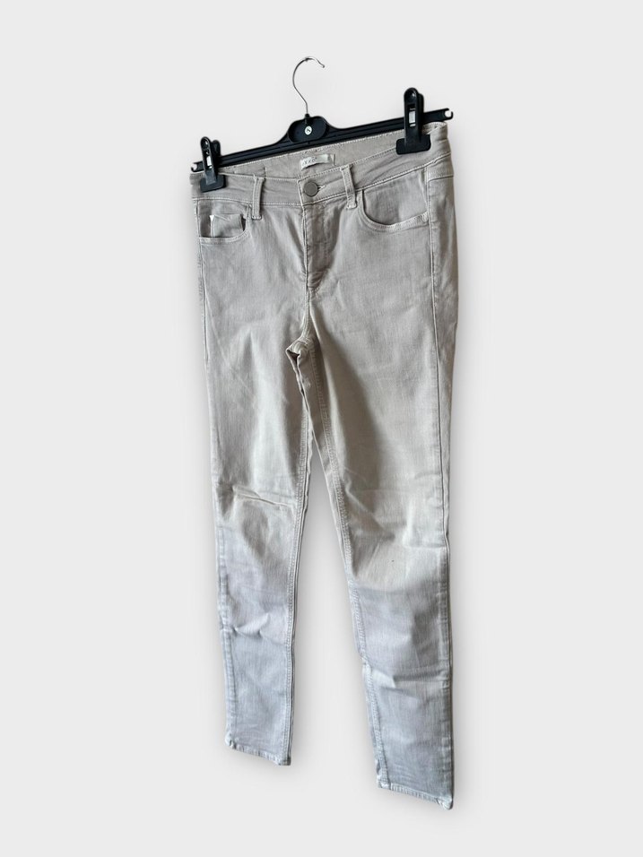 Bej renkli, düz desensiz, normal boy ve regular fit kesime sahip kadın denim pantolon, günlük sokak stili için uygun. Oxxo S beden temiz kullanılmıştır. Bel 35 cm uzunluk 95 cm paça 12 cm