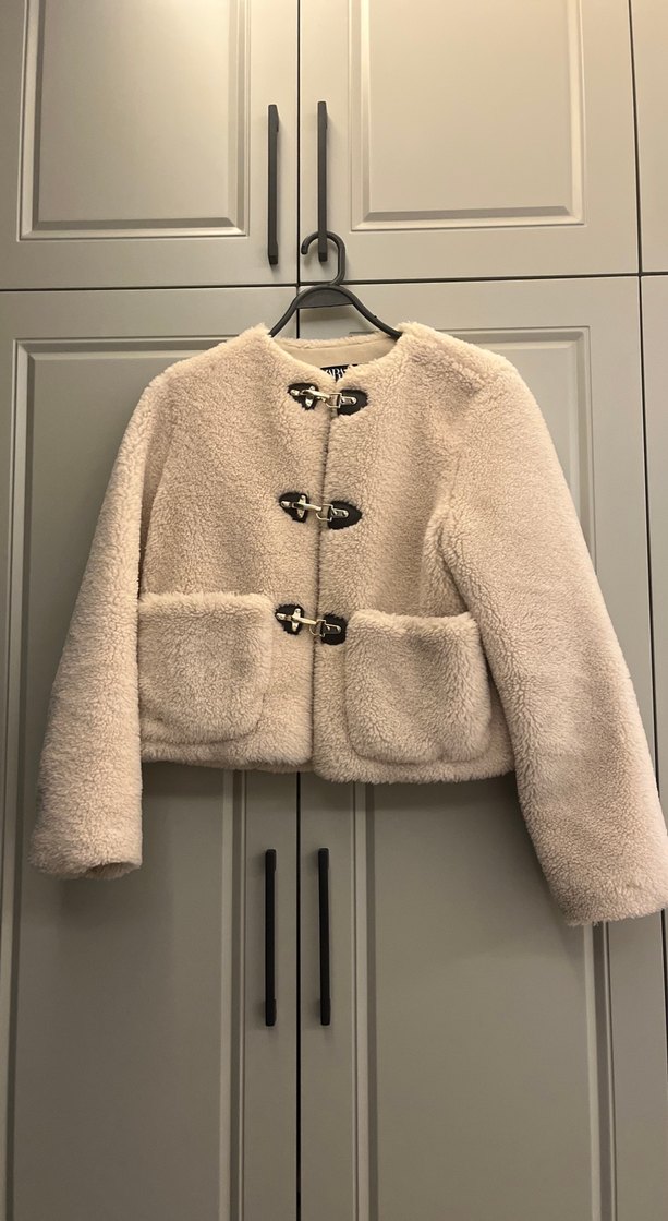 Bej renkli, uzun kollu, bol kesim kadın ceket. Kürk detaylı, çıtçıtlı ve iki ön cepli, midi boyda rahat ve şık bir parça.