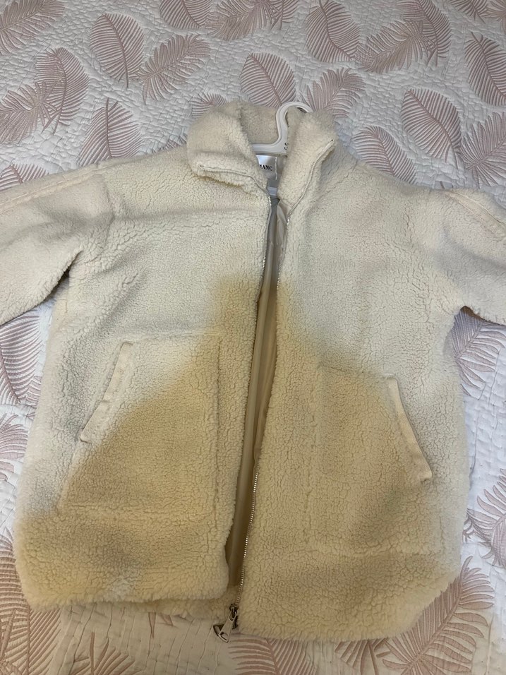 Bej renkte, peluş kumaştan yapılmış kadın ceket. Yüksek yakalı, uzun kollu ve rahat kesimdir. Midi boyda ve günlük kullanıma uygundur.
