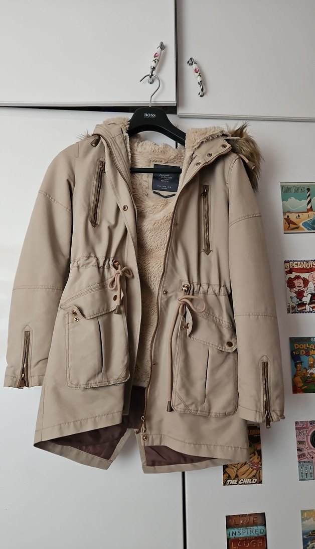 Bej renkte, peluş detaylı ve yumuşak astarlı kadın mont. Bol kesim, fermuarlı cepler ve bağcıklı kapüşon bulunur, rahat sokak stili için uygundur. İçerisindeki peluş kısım çıkarılıp trençkot olarak kullanılabilmekte.