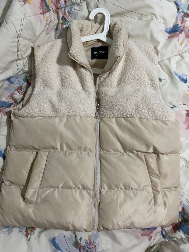 Bej, kolsuz, peluş detaylı ve straplez yakalı, sıcak tutan rahat bir sokak stili yelek. 40 yazdığına bakmayın kalıp olarak M beden. Rengi “Bej” seçenek olmadığından beyaz olarak işaretledim. Bir kere kullandım defosu vs yok.