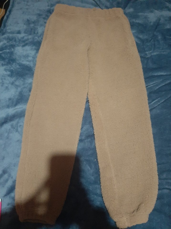 Bej renkte, peluş detaylı, bol kesim kadın eşofman altı. Yumuşak ve sıcak kumaştan, midi boyda, sade ve rahat stil için uygundur.