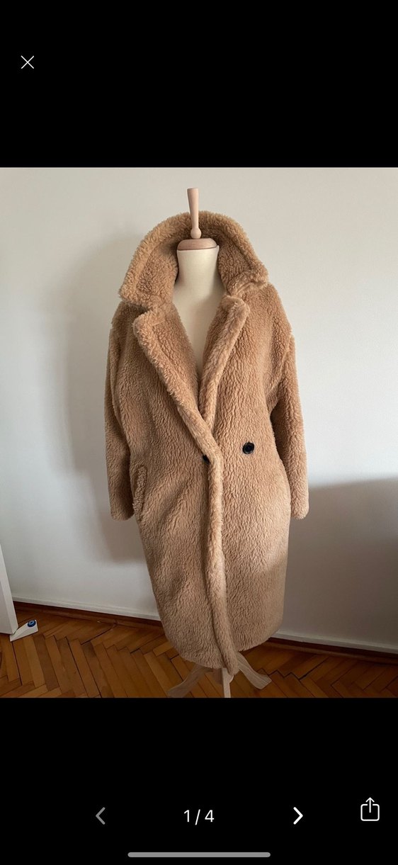 Bej renkli, peluş detaylı yumuşak kumaştan midi uzunlukta kaban. Notlu yaka ve uzun kollu, bol kesim normcore tarzıyla günlük kullanıma uygun.