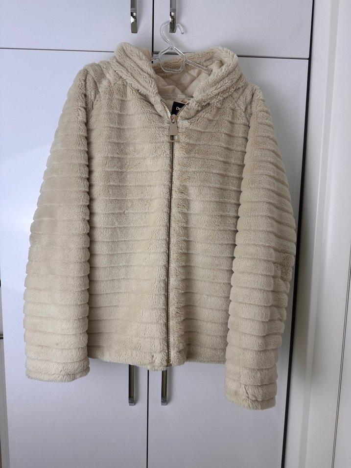 Yumuşak peluş dokulu, kapüşonlu ve fermuarlı bej kadın ceket. Rahat kesim ve uzun kollu, gündelik kullanım için uygun.