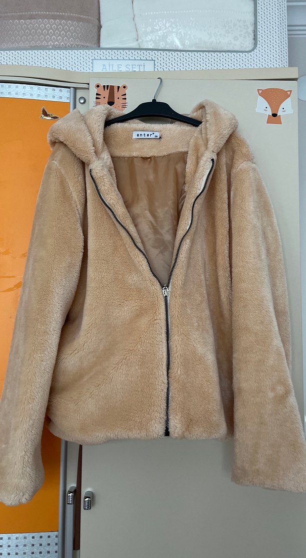 Bej renkli, peluş kumaştan, kürk detaylı, uzun kollu ve kesik yaka kadın ceket. Bol kesimli, fermuarlı ve günlük sokak giyimine uygun.
