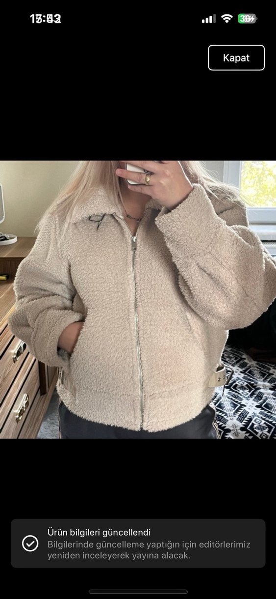 Bej renkli, yumuşak ve sıcak peluş kumaştan yapılmış, kürk detaylı ve kesik yaka özellikli kadın ceket. Rahat kesimi ve uzun kolludur, günlük sokak stili için uygundur.