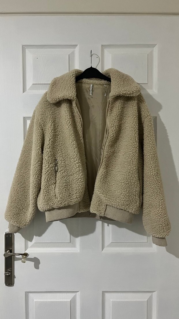 Bej renk, peluş kumaşlı, bol kesim, uzun kollu kadın ceket. Notlu yaka ve midi boy ile günlük sokak stiline uygundur. S beden