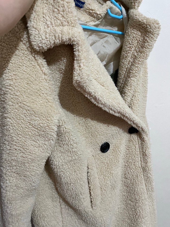 Bej renkte, yumuşak ve sıcak kumaştan yapılmış, uzun kollu, peluş detaylı kadın midi kaban. Rahat ve salaş kesimiyle günlük kullanıma uygundur.
