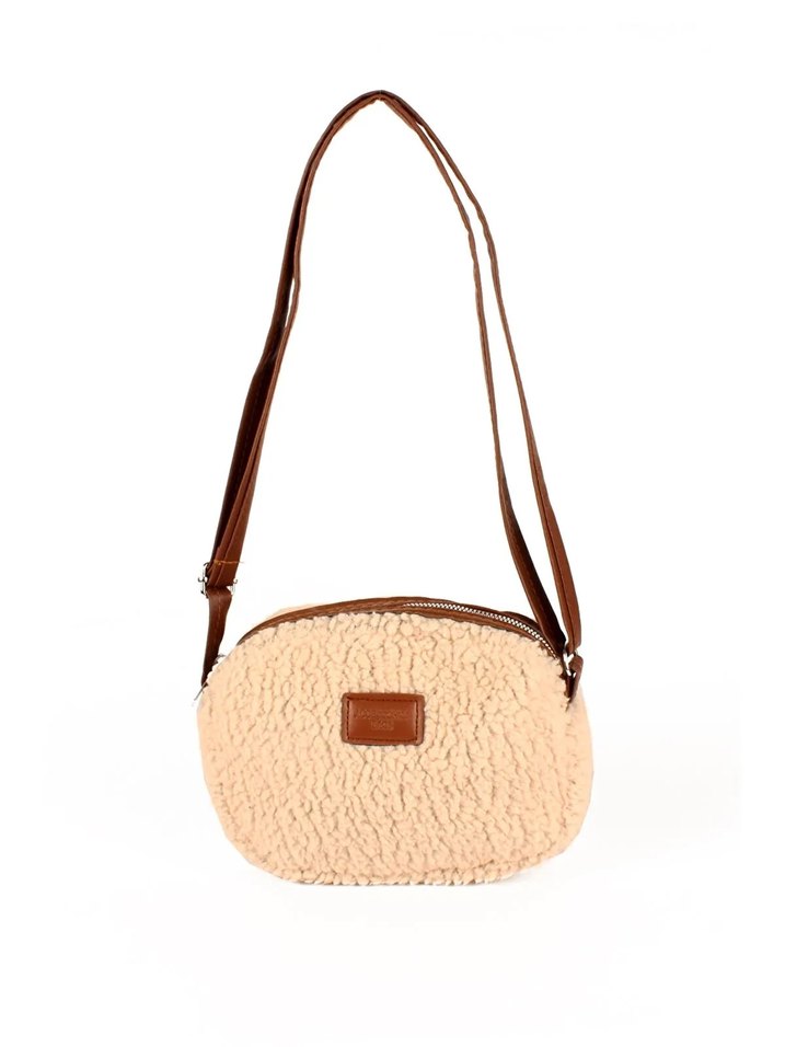 Bej renkte, yumuşak peluş detaylı kadın omuz çantası, ayarlanabilir kahverengi askıyla bohem tarzda. Günlük kullanıma uygun. 1 , 2 kere kullandım , marka temsilidir