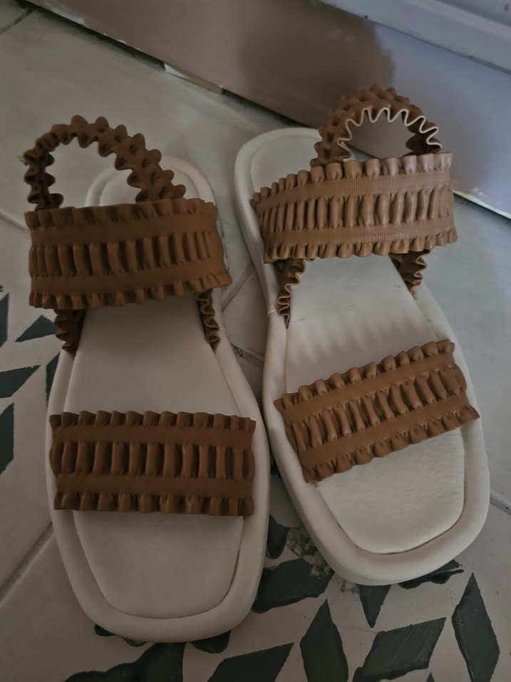 Bej renkte, pilili kauçuk bantlara sahip dolgu topuklu kadın sandaletleri, minimalist tasarımıyla günlük kullanıma uygun.