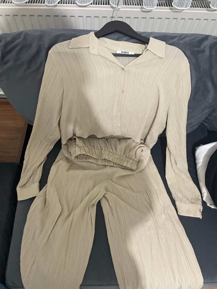 Bej renkli keten kumaştan, pilili ve bol kesim uzun kollu kadın tulumu. Notlu yaka detayıyla günlük rahat şıklık sunar.