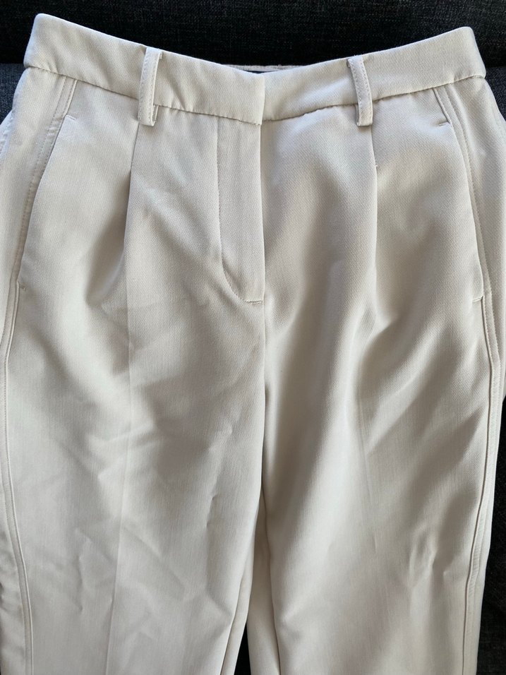 Bej renkli, pilili ve bol kesim kadın pantolon. Ofis ortamına uygun sade ve desensiz tasarım.