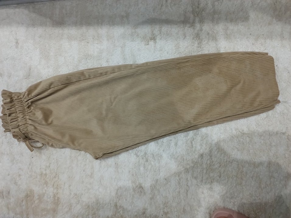 Yumuşak sentetik kumaştan, pilili detaylı bej kadın pantolon, rahat kesim ve midi boyda S-M beden uyumlu