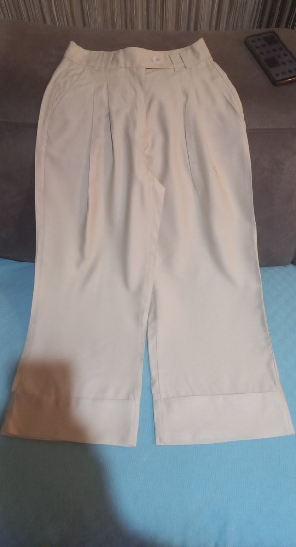 Bej renkli, midi boy, pilili ve regular fit kadın kumaş pantolon. İpeksi dokusu ve sade tasarımıyla ofis stiline uygun.
