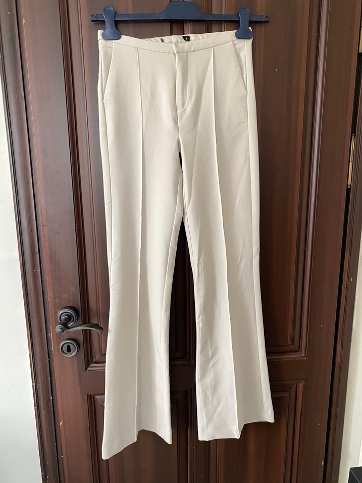 Bej renkte, pilili ve kadın kumaş pantolon. Düzenli kesimli, sentetik kumaştan, ofis için uygun, minimalist ve şık bir tasarım.