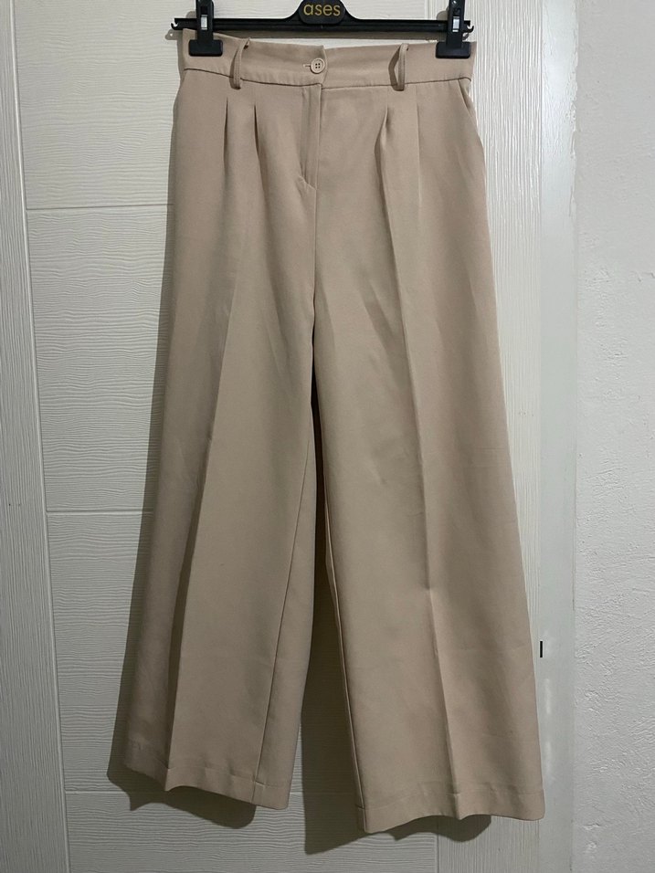 Ofis kullanımı için uygun, pilili tasarımlı, regular fit bej midi uzunlukta kadın kumaş pantolon. Yumuşak sentetik kumaştan, trend günlük stil için uygun.