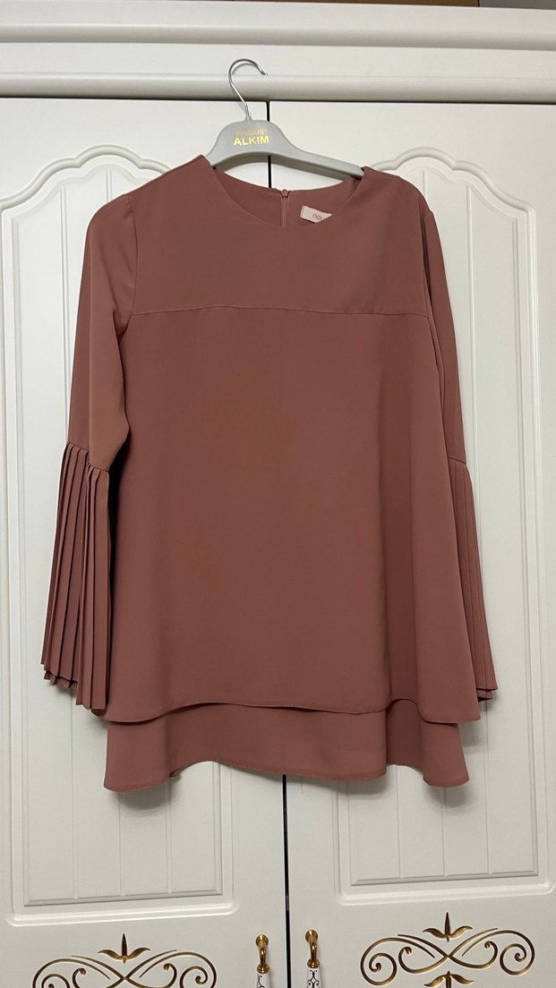 Bej renk, pilili uzun kollu kadın tunik. Salaş kesim, yuvarlak yaka ve midi boy. Yumuşak sentetik kumaştan, minimalist tarzda. Ofis için uygun.