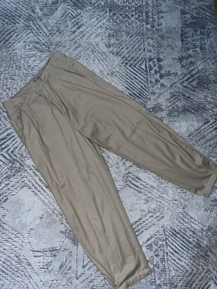 Bej renkli kadın, piliseli ve rahat kesimli midi boy pantolon. Günlük sokak tarzına uygun, şık ve konforlu. Ürün büyük diye hiç giyilmedi etiketi mevcut değil ancak sıfır ürün